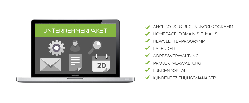 Angebots- Rechnungsprogramm, Homepage & Domain, E-Mails, Newsletterprogramm, Kalender, Adressverwaltung, Projektverwaltung, Kundenportal, Kundenbeziehungsmanager